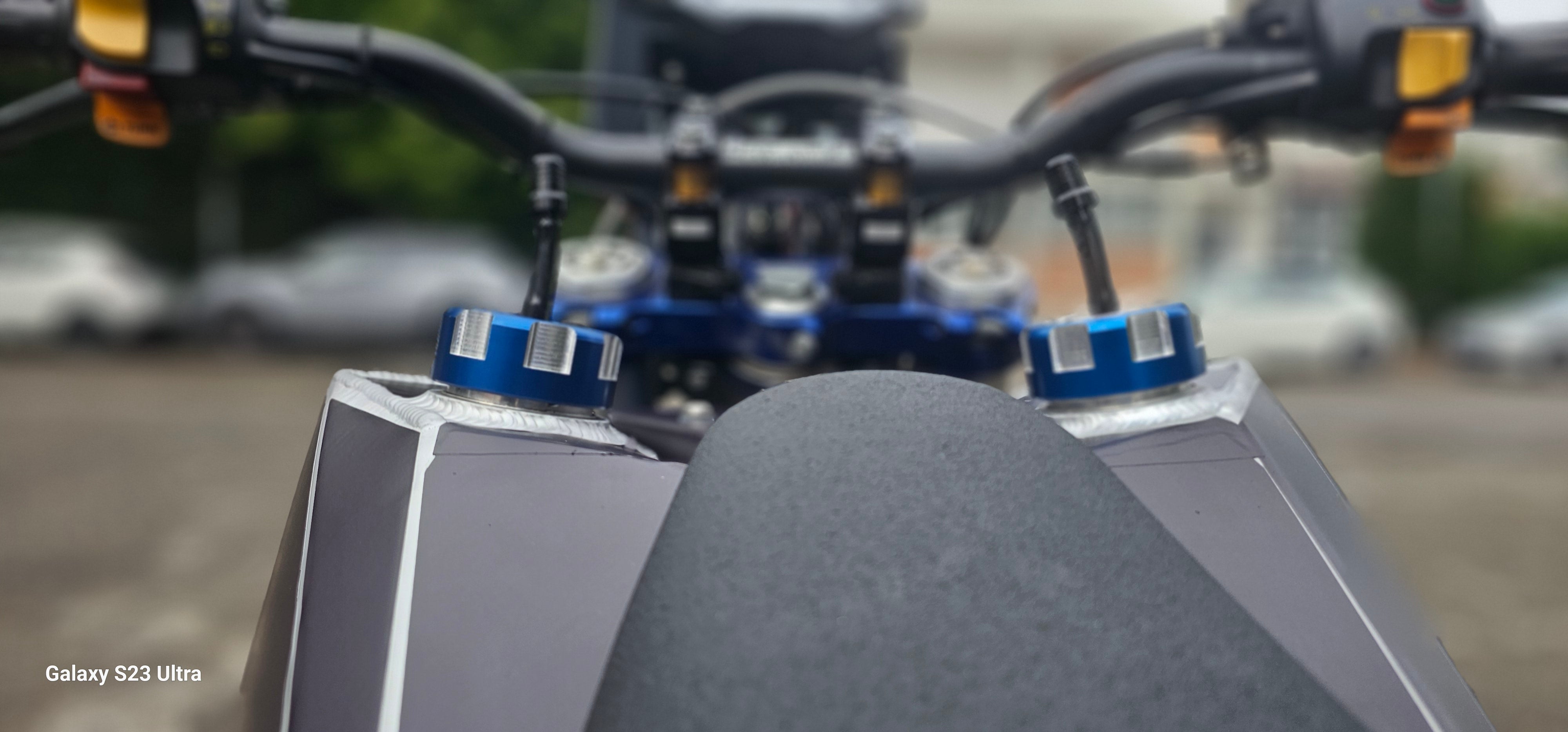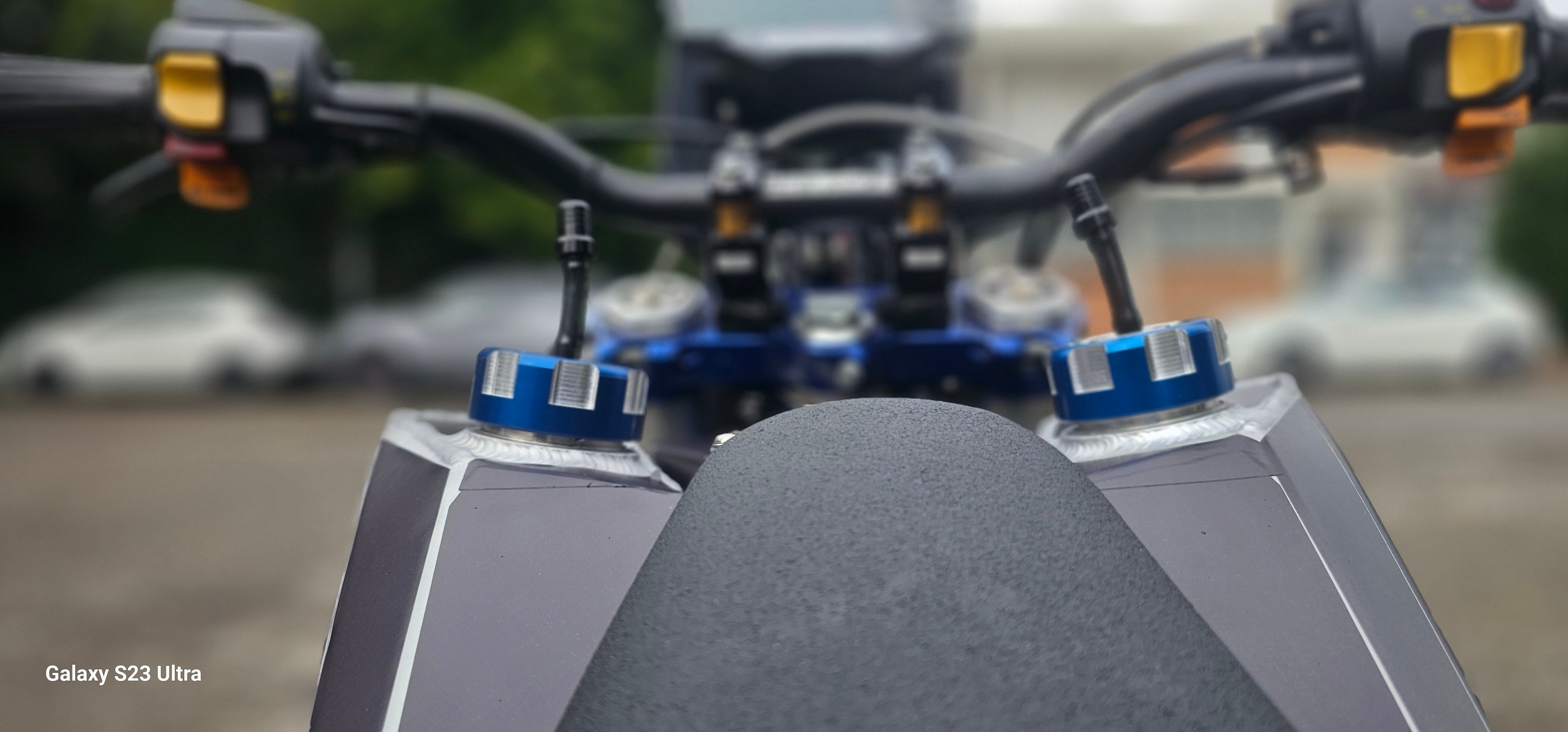• Autonomia Prolungata: Coppia di serbatoi anteriori in alluminio da 9 litri ciascuno, completamente personalizzati.